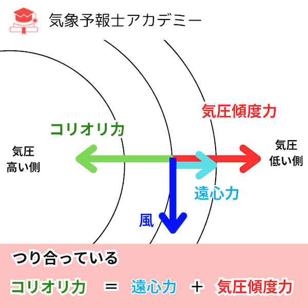 傾度風は、以下の①②③の力が釣り合うことにより吹く。